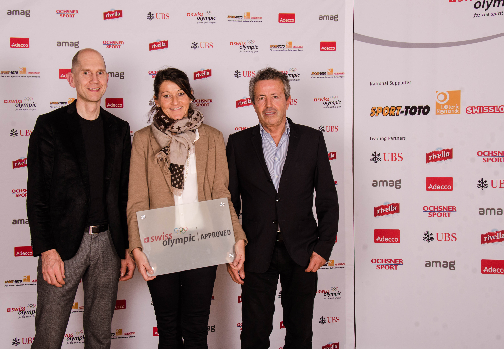 Prof. Dr. Sönke Johannes (Medizinischer Direktor Rehaklinik Bellikon), Dr. Regina Schelble (medizinische Leitung Sportmedizin) und die Schweizer Sportmedizin-Legende Dr. Hans Spring nehmen das begehrte Label entgegen