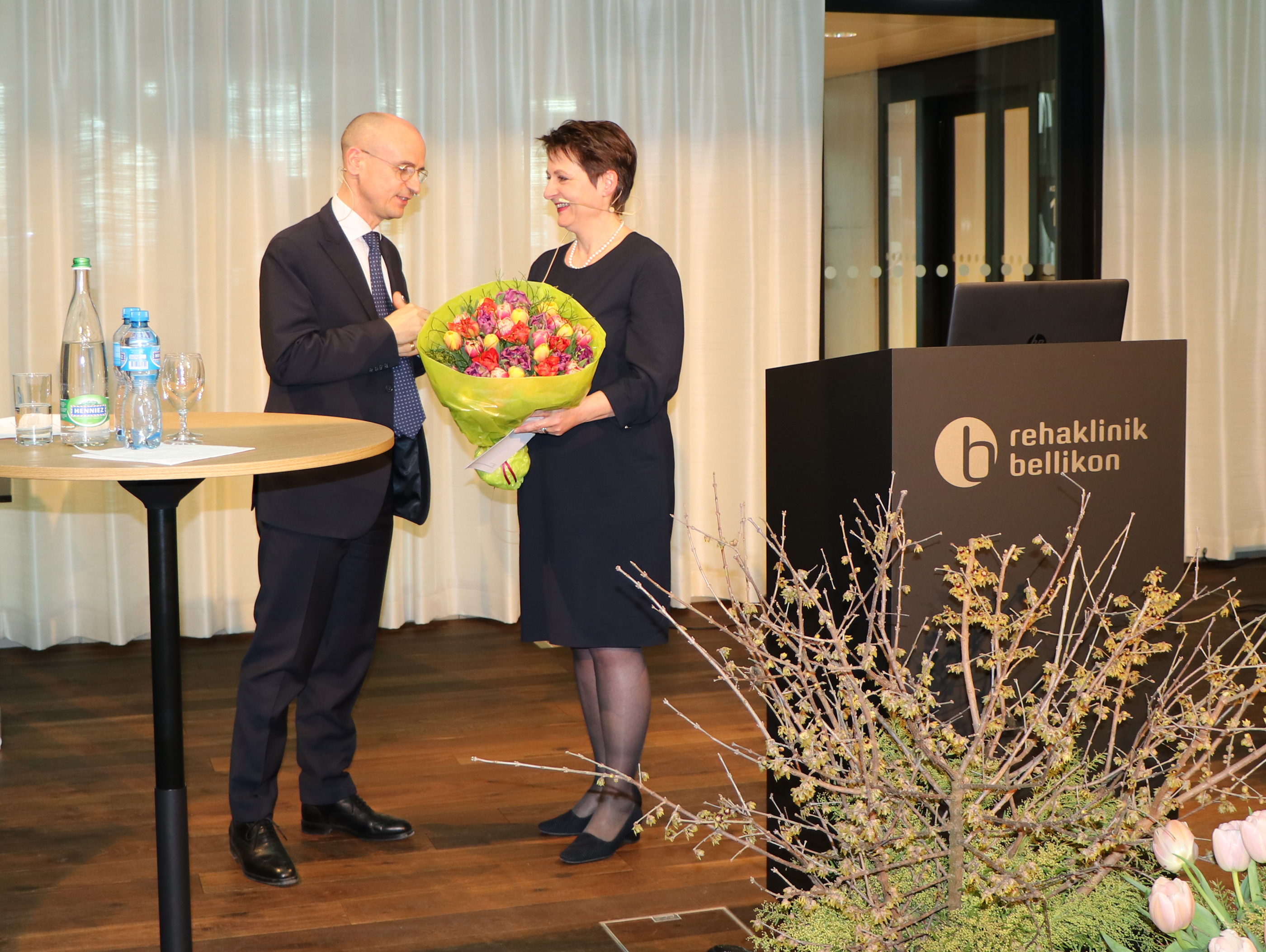 Klinik-CEO Dr. Gianni R. Rossi bedankt sich bei Frau Regierungsrätin Franziska Roth für ihre Grussbotschaft