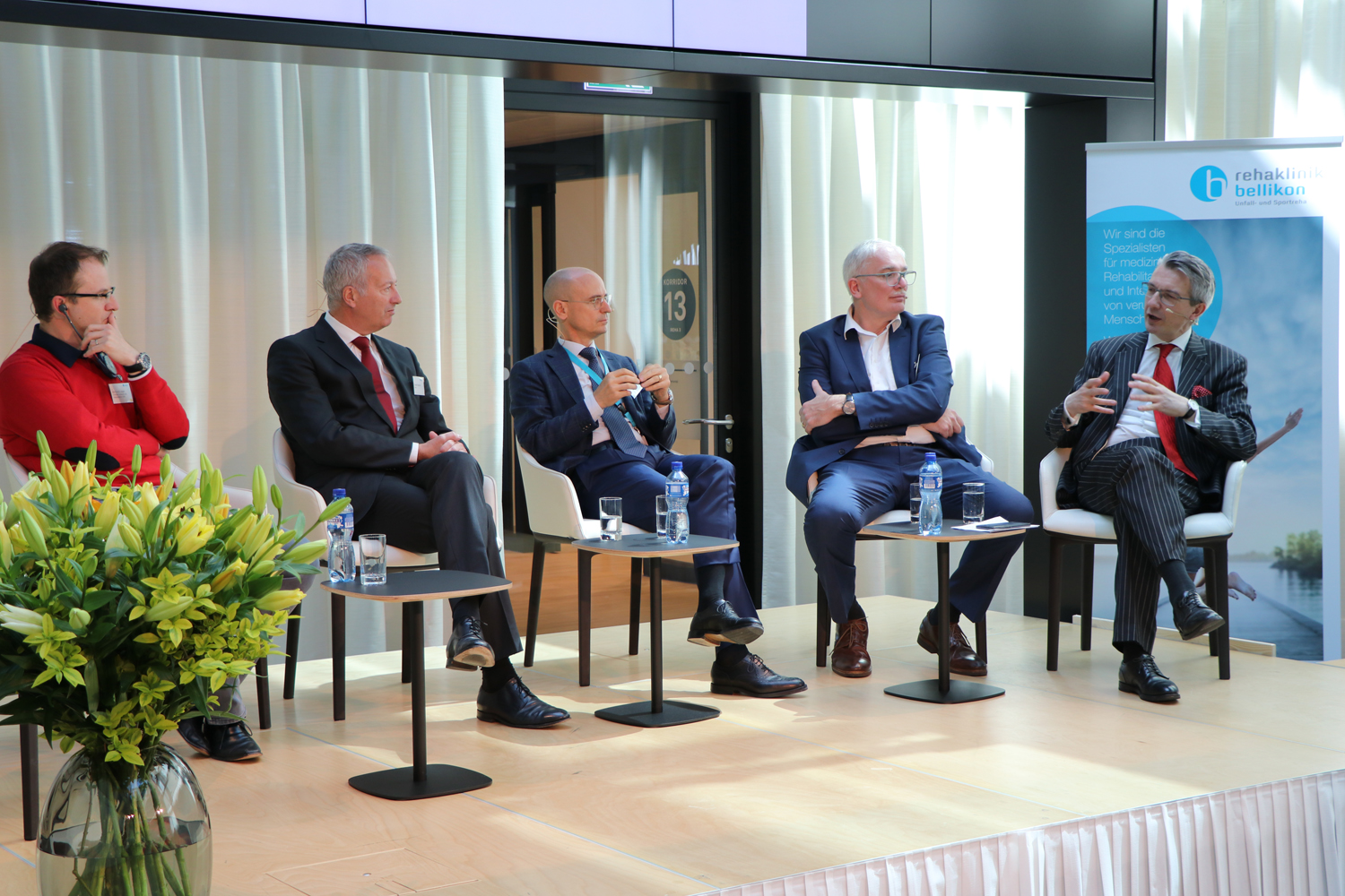 Im Gespräch von links nach rechts: Dr. Bertrand Léger, Forschungsleiter der Clinique romande de réadaptation in Sion; Daniel Roscher, Mitglied der Geschäftsleitung der Suva; Dr. Gianni Roberto Rossi, CEO der Rehaklinik Bellikon; Thomas Lack, Leiter Case Management Basler Versicherung; Dr. Willy Oggier, Gesundheitsökonom